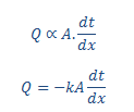 Where Q is the rate of heat flow, A is the area perpendicular to the flow, 'dt' is the temperature difference between length 'dx' and k is thermal conductivity of the substance as I already mentioned before. –ve sign indicates that decreasing temperature along increasing the length or thickness. To know more see one dimensional heat conduction.