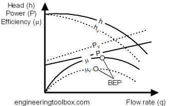 • efficiency of pump is reduced and the Best Efficiency Point - BEP - is moved
