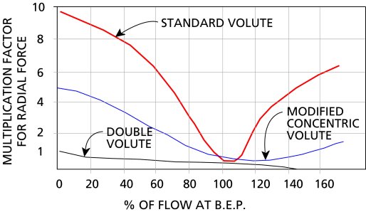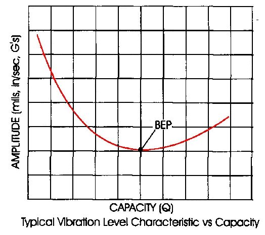 Operating outside this range will lead to excessive vibration, recirculation and cavitation, see the next two figures. The first one from the Pump Handbook from McGraw-Hill which shows how the axial force increases with the distance in terms of percent flow from the B.E.P. and the second from Goulds essentially shows the same information but in terms of vibration.