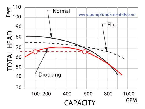 When the flow increases, the discharge pressure of the pump decreases, and when the flow decreases the discharge pressure increases