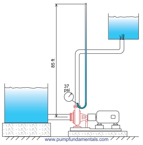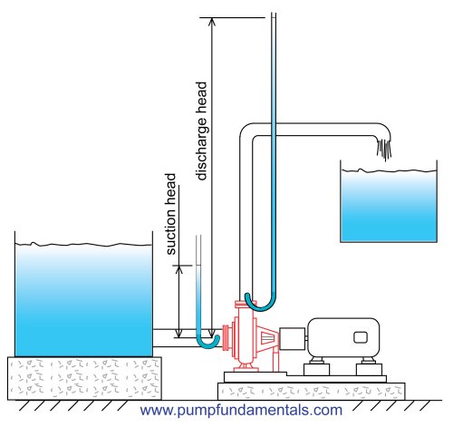Total head and flow are the main criteria that are used to compare one pump with another or to select a centrifugal pump for an application. Total head is related to the discharge pressure of the pump. Why can't we just use discharge pressure? Pressure is a familiar concept, we are familiar with it in our daily lives. For example, fire extinguishers are pressurized at 60 psig (413 kPa), we put 35 psig (241 kPa) air pressure in our bicycle and car tires.For good reasons, pump manufacturers do not use discharge pressure as a criteria for pump selection. One of the reasons is that they do not know how you will use the pump. They do not know what flow rate you require and the flow rate of a centrifugal pump is not fixed. The discharge pressure depends on the pressure available on the suction side of the pump. If the source of water for the pump is below or above the pump suction, for the same flow rate you will get a different discharge pressure. Therefore to eliminate this problem, it is preferable to use the difference in pressure between the inlet and outlet of the pump.
