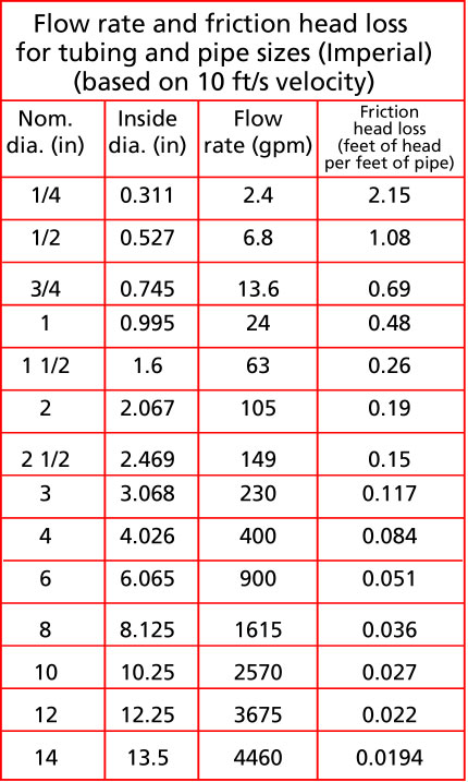 Table 1 gives the flow rate and the friction head loss for water being moved through a pipe at a typical velocity of 10 ft /s. I have chosen 10 ft/s as a target velocity because it is not too large which would create allot of friction and not too small which would slow things down. If the velocity is less, then the friction loss will be less and if the velocity is higher the loss will be greater than is shown in Table 1. For the suction side of the pump, it is desirable to be more conservative and size pipes for a lower velocity, for example between 4 and 7 feet/second. This is why you normally see a bigger pipe size on the suction side of the pump than on the discharge. A rule of thumb is to make the suction pipe the same size or one size larger than the suction connection.