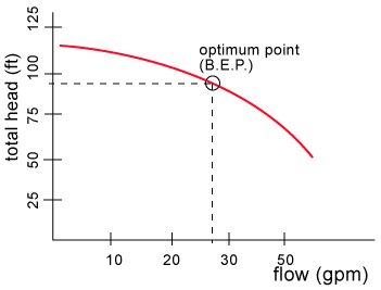 What is the pump rating? The manufacturer will rate the pump at its optimum total head and flow, this point is also known as the best efficiency point or B.E.P.. At that flow rate, the pump is at its most efficient and there will be minimal amount of vibration and noise. Of course, the pump can operate at other flow rates, higher or lower than the rating but the life of the pump will suffer if you operate too far away from its normal rating. Therefore, as a guideline aim for a maximum variation of plus or minus 15% on total head.