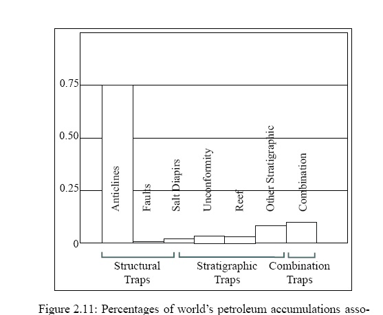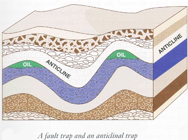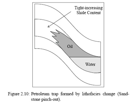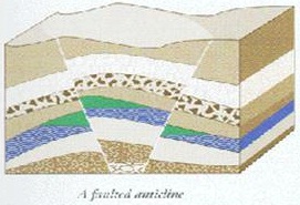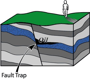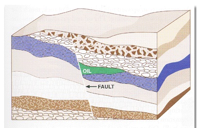Fault implies fracturing of rock and relative motion across the fracture surface. Consider a possible sequence of geologic events that, in geologic time, . Sedimentary beds are deposited in a water environment, as indicated by the presence of shale’s and limestone’s. During or after lithification,geologic events result in uplift of these original horizontal sediments, and fracturing and tilting above sea level, so that the surface rocks are exposed to erosion. During uplift, the rocks are fractured and slippage occurs along the fault plane.This brings the shale across the fault so that it seals the tilted sandstone below the fault. Millions of years later, hydrocarbon generated in its source rock down elevation from the fault is forced into the connate water-saturated sandstone. Since the hydrocarbon is less dense than the water, it will migrate up elevation, displacing the heavier water down elevation. This upward migration will continue until it reaches the fault and is trapped by the impermeable shale. If the faulting had not occurred, the hydrocarbon would have continued to migrate upward until it was dissipated at the surface into the environment. Since faulting occurred, the shale provides the necessary seal, resulting in the existence of the hydrocarbon reservoir.Notice that, in this example, if slippage had occurred to a greater extent, there would have been flow into the permeable sandstone above the fault. The hydrocarbon would have been lost to the surface, and no reservoir would have been formed.This situation illustrates the significance of geologic probability.