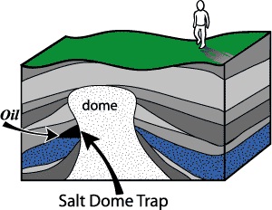 dome. A salt dome region, therefore, is an excellent geologic environment for all three types of traps discussed so far.An excellent example of a salt dome trap is Spindle top near Beaumont, Texas. The first major discovery and resultant initial oil boom at Spindle top occurred in 1901. Through the 1890s Patillo Higgins had promoted drilling for oil outside Beaumont.He concluded that it was an excellent geologic environment for hydrocarbon reservoirs, because he noted a location near Beaumont where the surface elevation was 15 ft higher than the surrounding land. This rise was a circle approximately 1 mile in diameter. He concluded that this indicated high points in the underlying geology. In 1901, Captain Anthony Lucas drilled a wildcat well at this location, resulting in the Spindle top discovery. Future drilling confirmed that this reservoir existed as an anticlinal dome trap, with the dome created by the uplift of overlying rocks by an intruding salt dome in the subsurface,creating the surface indication of what the subsurface geology might be.The second oil boom at Spindle top began in the mid-1920s.