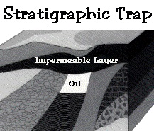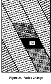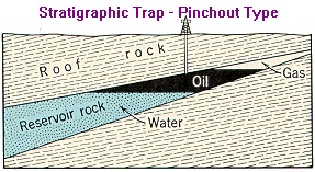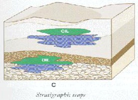 These traps result from deposition of elastic or chemical materials. Shoestring sands, lenses, sand -----es, bars, channel fillings, facies changes, strand-line (shoreline) deposits, coquinas, and weathered or reworked igneous materials are classified as elastic sedimentary deposits and can result in stratigraphic traps. An ancient sand-filled stream channel meander has cut into older south-dipping shales and created a perfect stratigraphic trap.