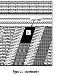 Erosion creates a major part of these through truncation of the reservoir rock. On-lap deposition (when the water is encroaching landward), off-lap deposition (when the water is regressing), and the chemical alteration of limestone result in many secondary stratigraphic traps) It is a truncation of the Woodbine formation as it approaches the regional Sabine uplift. A certain amount of leaching of the cementing material by waters over the unconformity has resulted in increased porosity and permeability in the field as compared with similar Woodbine sands in the deeper portions of the East Texas basin.